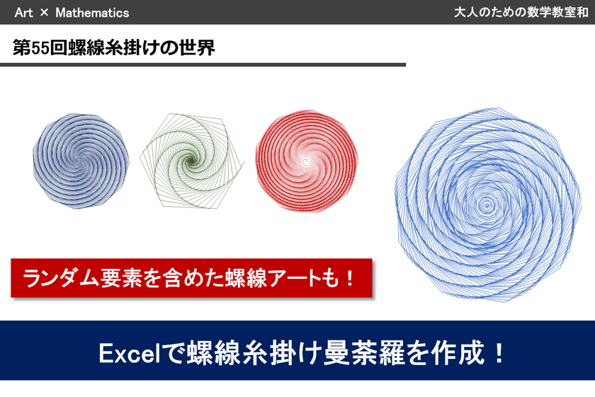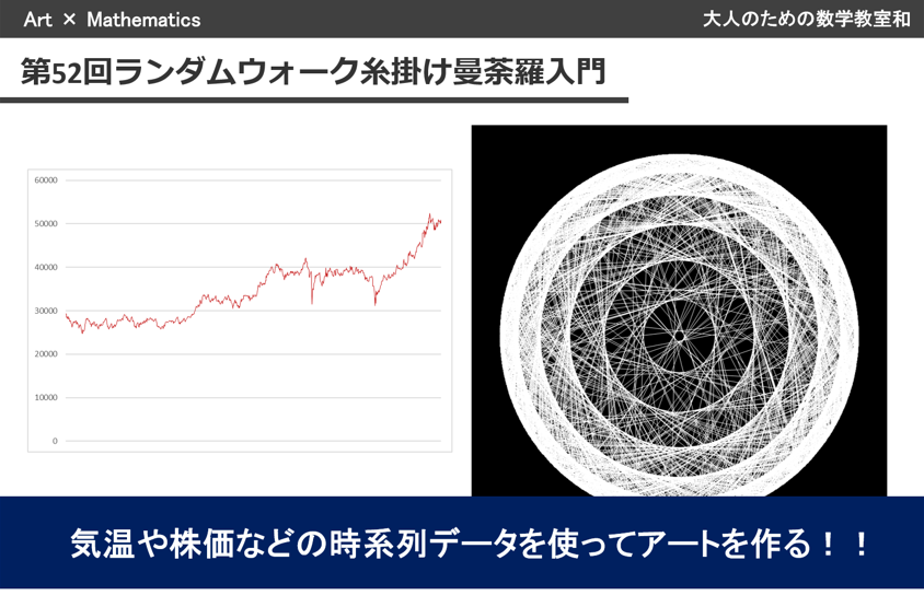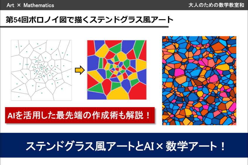 サブスクリプションサービス「数学アートサロン“MAS”」では、美しいデザイン・アートの数学的側面からの視点、数学的モチーフの深遠さについての動画を、何度でもご視聴いただけます。その他にも社会で役に立つ算数の「おもしろ話」から数学の深淵な話などもご紹介しています。
